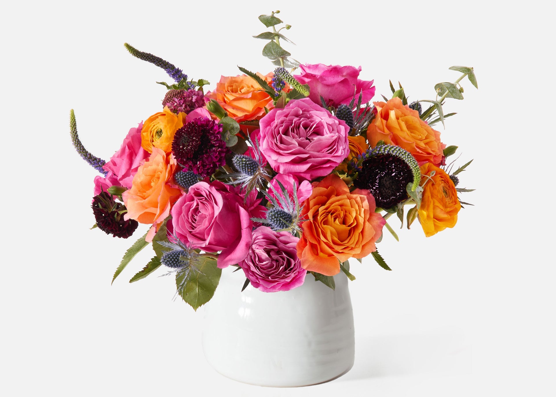 What takes a floral centerpiece from “DIY charm” to that instagram-ready, professional look? It’s all about how you style the stems! Whether you’re doing flowers for a graduation party, a baby shower, a cookout, or just for a friend’s dinner we’re here to give you all the tips you’ll need to arrange the perfect Summer Centerpiece. This bright arrangement features a stunning combination of rare garden roses, delicate ranunculus, and lacy scabiosa in a citrus-y summer palette that we just adore. So, here’s how you work those stems into a show stopping centerpiece for your next summer gathering: