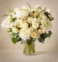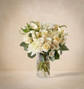 When words fall short, there are always flowers. This tranquil all-white bouquet embodies serenity and grace in the form of pure white blooms. Its elegant simplicity makes it a perfect gift for moments that call for quiet reflection, heartfelt sympathies, or a gesture of pure, unspoken kindness.