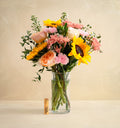 Roses, Sunflowers, Carnations, Cushion Pom, Aster, Greenery paired with Poppy & Pout Lemon Bloom Lip Balm