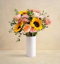 Golden tones meet crisp greenery in a bouquet that feels optimistic and grounded. Sunflowers add warmth and presence, while softer blooms keep the look refined. Designed to brighten a room without overpowering it. A confident nod to sunnier days.