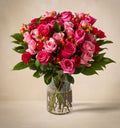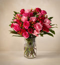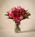 A dance of delicate pinks and blushes, The Coquette whispers tales of enchantment. Spray roses twirl beside blushing hypericum berries, inviting admiration. Roses reign in this romantic symphony, captivating the senses, while Cocculus foliage and emerald ruscus add a playful sway to this composition.
