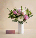 Roses, Mini Carnations, Cremon, Snap Dragon, Veronica, Alstroemeria, Greenery in a 4.25" x 9" Glossy White Abstract Ceramic Vase with milk + honey bath bomb trio including Lavender and Eucalyptus, Pink Grapefruit, Bergamot, Cardamom, and Blood Orange, Ginger, and Lemongrass