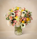 Timeless elegance is the hallmark of this classic bouquet of roses and ranunculus. It boasts pastel shades of pink, accents of yellow and cream, and highlighted by spiral eucalyptus with green sprigs. The Pink Lady is a perfect centerpiece for a spring brunch al fresco or to liven up a kitchen or dining room. This arrangement makes a gracious thank-you gift, but it’s just as delightful as a gift for yourself because you deserve it.