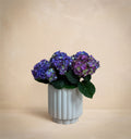 A fresh, coastal-inspired plant that captures the calm of spring by the water. Lush purple hydrangea blooms are paired with a soft light blue vessel, echoing sea and sky tones. Hydrangeas are traditionally associated with gratitude and heartfelt emotion, adding quiet meaning to the design. Cool, serene, and effortlessly refined.