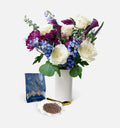 Roses, Mini Callas, Veronica, Delphinium, Alstroemeria, Mums, Thistle, Eucalyptus in a 3.75" x 8" White Textured Ceramic Vase with Ritual Chocolate 8oz. Mid Mountain Blend Hot Chocolate